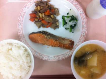 今日の給食は和食のメニューでした。大豆の五目煮は、大豆の他に鶏肉、れんこん、にんじん、こんにゃくが入り、歯ごたえが残るように煮ています。かぶの浅漬けには、かぶの茎や葉も入れ、彩りよく仕上げました。かぶの葉には、こまつなやほうれん草と同じように、カルシウムを含んでいます。