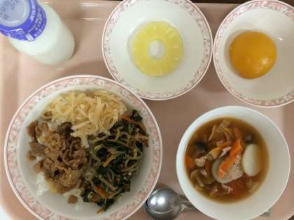 11月28日(木)の給食 公開日 2013/11/28 更新日 2013/11/28 給食 ビビンパ トック入りキムチスープ 牛乳 ★果物リザーブ★ パインorピーチ 今日のビビンパは、豚肉・ナムル・大根の3種の具がのっています。「ピビム」が「混ぜ」、「パプ」が「飯」というのが語源です。スープの中に入っているトックは、韓国のおもちです。もち米ではなく、うるち米を使って作られています。 リザーブの結果は、パイン135人:ピーチ117人でした。 いいね(0)