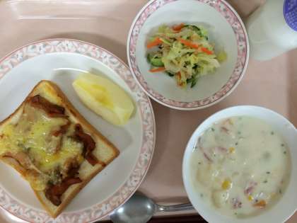 12月11日(水)の給食 公開日 2013/12/11 更新日 2013/12/11 給食 ピザトースト コーンチャウダー ツナサラダ 果物(りんご) 牛乳 今日のコーンチャウダーは、ホワイトルウから手作りしています。コーンの他にもベーコン、玉ねぎ、にんじん、じゃが芋、ほたても入っています。今日も寒かったので、「スープで体が温まりました。」と言ってくれました。 いいね(0)