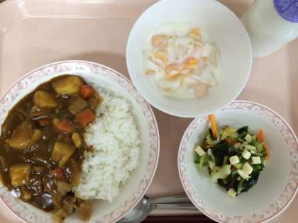初日は、リクエストメニューにもあがったカレーライスでした。今日は豚肉を使い、野菜のゴロゴロ入ったカレーです。久々の給食を楽しみにしていてくれた人も多かったようです。