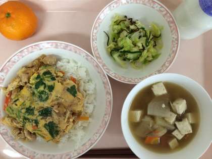 1月14日(火)の給食 公開日 2014/01/14 更新日 2014/01/14 給食 親子丼 けんちん汁 昆布和え 果物(みかん) 牛乳 今日の親子丼は、たっぷりの鰹節でだしをとっています。給食の親子丼は、オーブンでじっくり加熱して作ります。ほとんどのクラスで完食してくれました! いいね(0)