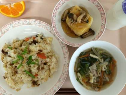 今日は、穴子の入ったお寿司でした。甘辛いたれをかけて蒸したあなごとにんじん、油揚げをご飯に混ぜ、絹さやを散らしています。沢煮椀には、千切りにしたにんじん材料が入った汁物です。今日はどのクラスもお寿司完食でした!