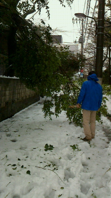 駒込中近辺、プラウドの裏の民家の大きい枝が3本折れています。(1本は下に置いてあり、2本は垂れさがっている)