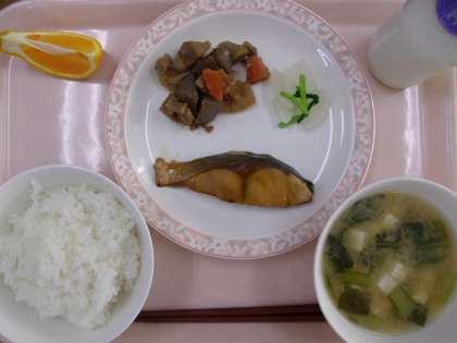 今日の魚は「鰤(ぶり)」です。先日の雪の影響で入荷が難しいとの連絡がありましたが、魚屋さんが調達してくださいました。漢字「鰤」は師走に脂が乗っておいしく魚だから、または師は大魚であることを表すため、などの説があります。今日は、甘辛い七味の入ったタレをかけて食べました。