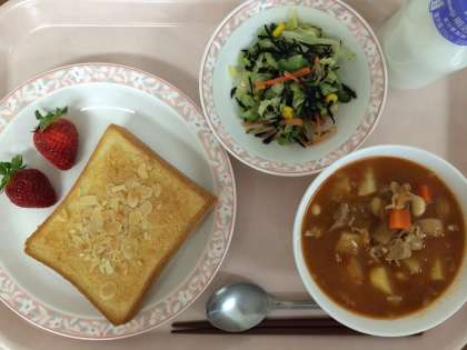 今日のポークビーンズは、大豆が1人20gとたくさん入っています。今日も寒かったので、温かいスープが喜ばれたようです。アーモンドトーストは、リクエストメニューでした。粉末アーモンドの入ったペーストを塗り、さらに上にアーモンドスライスをのせて焼いています。3年生の女の子たちは「今日の給食、大満足でした!」と言ってくれました。