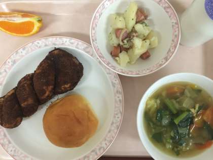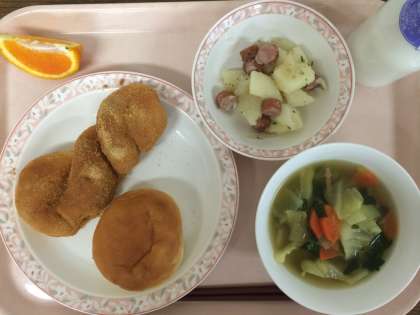 今日の揚げパンはリクエストメニューでした。さっと揚げたパンにまぶすきな粉とココアどちらかを選びました。結果、きな粉150人:ココア104人と若干きな粉が勝りました。