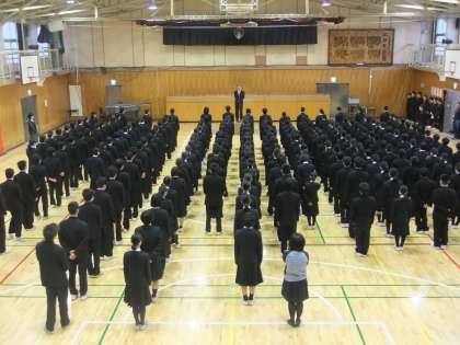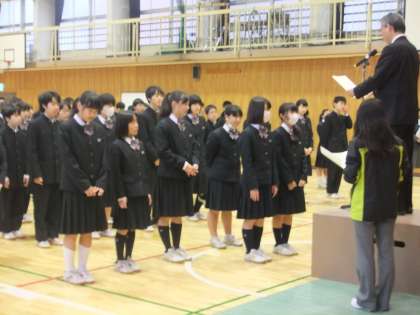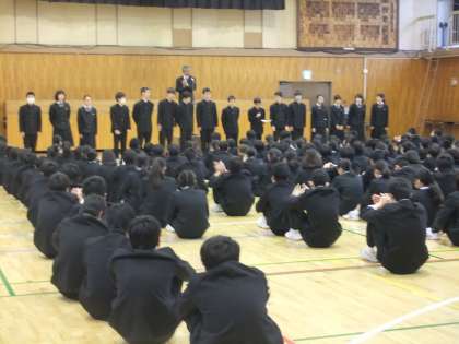 大野校長先生より:新入生の入学に当たっての不安(怖い先生や先輩がいたらどうしよう)を紹介し、そうではなかったこと。また、66年前に国連で決定された世界人権宣言から、人間社会において差別や偏見を無くすことの難しさについて考え、生徒の皆さん一人一人が学校生活において友達を差別しない、いじめを許さない努力をすることが大切。その実践により社会に貢献できる人になって欲しい。