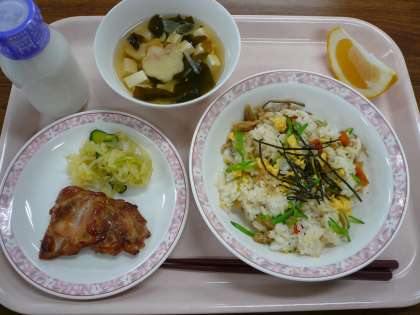 本日は離任式に合わせ、ちらし寿司を作りました。かんぴょう・油揚げ・にんじんなどを甘辛く煮て、酢飯と合わせ、絹さやと炒り卵を上に散らしています。彩りもキレイで、ほとんどのクラスが完食してくれました。鶏肉の照り焼きもパリっと焼きあがり、好評でした。