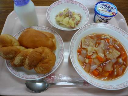 今日は人気メニューのきな粉揚げパンで、どのクラスも完食していました。新しい油でカリッと揚げたパンにきな粉・砂糖をまぶしています。