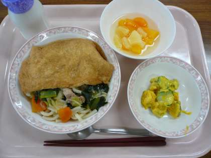 今日のきつねうどんは大きい揚げが一人一枚のっています。大きな釜で破れないように丁寧に煮ています。かぼちゃサラダは、かぼちゃを大き目のいちょう切りにし、食感が楽しめるようにしています。