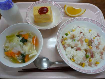今日のスパニッシュオムレツはスチームコンベクションオーブンで30分以上、蒸し焼きにして作りました。じゃが芋・玉ねぎが入っていて、高さが7cmぐらいあるオムレツに仕上がりました。「おいしい」「ケチャップがのっててカワイイ」という声が聞こえてきました。美生柑は河内晩柑とも呼ばれ、今が旬の果物です。