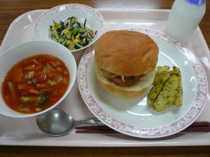 照り焼きチキンバーガーの中には、辛子マーガリンを塗り、ボイルキャベツと甘辛いタレにからめた鶏肉がはさまっています。のり塩ポテトは、新じゃがをくし形にカットして、素揚げし塩胡椒、青のりをまぶしています。教室では、「いただきます」と同時におかわりじゃんけんが始まっていました。