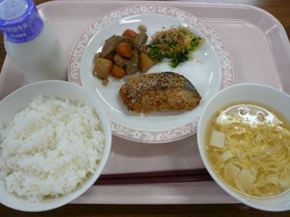 鰆の香味焼きは、しょうが・ねぎ・しょうゆ・酒などを一緒に下味を付け、ごまをふりかけて焼いています。しっとりとした焼きあがりになりました。