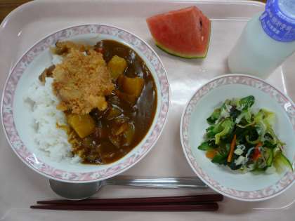 今日はチキンカツがのったカレーでした。給食室から、明日の運動会を頑張ってほしいという想いを込めて作りました。小玉すいかも甘いものを八百屋さんに持ってきてもらったので、お代わりじゃんけんが行われていました。ボリュームのある献立でしたが、午前中に運動会の練習もあったため、どのクラスもよく食べてくれました。