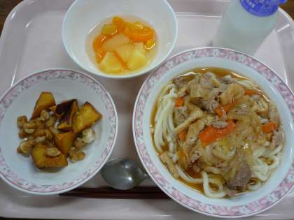 今日の肉うどんは、昆布とかつお節で出汁を取り、豚肉、にんじん、ねぎなどの具を煮ています。さつまいもと大豆の揚げ煮は、さつまいもは素揚げ、大豆は片栗粉をつけて揚げ、甘辛いたれを絡めました。大豆もサクサクとした食感で、豆嫌いの人でも食べやすかったようで、残りも少なく、食べてくれました。