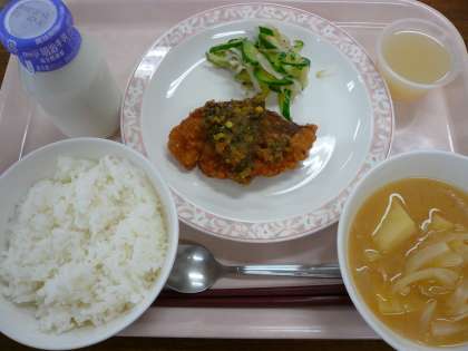 今日の竜田揚げは、ホキという白身魚を使っています。あまり聞き慣れない魚ですが、フィレオフィッシュなどに使用されており、食べた事がある方も多いのではないでしょうか。しょうゆ、酒、にんにく、みりんで下味をつけ、片栗粉でカラット揚げ、おろしソースをかけて食べました。魚だと残しが多いですが、今日はほとんど残りもなく、食べていました。