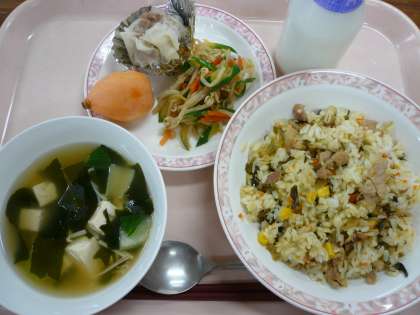 今日は手作りの焼売でした。約50gの肉だねを1つ1つ丁寧に皮に包み、蒸し上げ、名前の通り、食べ応えのあるジャンボ焼売になりました。どのクラスでもお代わりじゃんけんが繰り広げられ、食べ残しもありませんでした。また、今日のフルーツは今が旬のびわでした。おいしい時期は5〜6月にかけてで果皮にハリがあり色鮮やかなもの、産毛のあるものが新鮮です。保存方法は、常温で保管し、食べる直前に冷やすとおいしく食べられます。