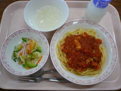 今日は、魚介類とトマトソースのスパゲッティでした。「ペスカトーレ」とは漁師という意味で、漁師が売れ残りなどをまとめてトマトソースで煮込んだものがはじまりと言われています。給食では、玉ねぎを甘みが出るまでよく炒め、あさり・いか・えびの魚介を入れて作りました。また、はちみつレモンゼリーは夏らしいゼリーに仕上がり、「楽しみ♪」という子がいました。
