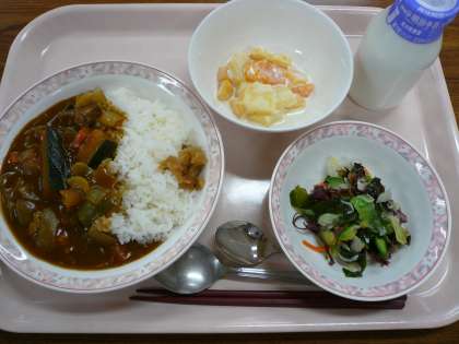 今日は、なす・ズッキーニ・かぼちゃなどの夏野菜がたっぷり入ったカレーでした。玉ねぎは30分以上じっくり炒め、甘みが出るようにしています。
