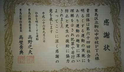 第64回“社会を明るくする運動”豊島区推進委員会より、豊島区立駒込中学校PTAとして、感謝状をいただきました。