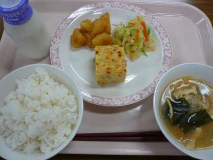 今日は2年生職場体験、3年生修学旅行のため、1年生のみの給食でした。千草焼きは甘めに味付けをした人参・玉ねぎ・ねぎ・鶏ひき肉を卵と一緒に焼いた、具だくさんの玉子焼きです。