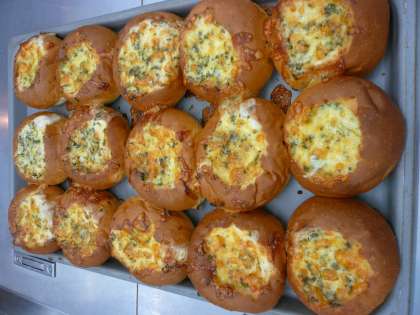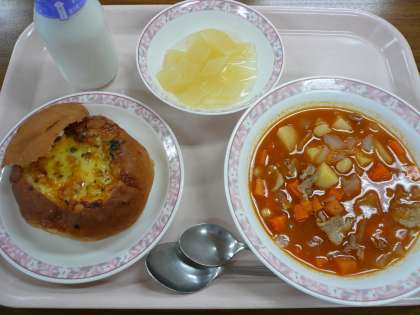 今日も1年生のみの給食でしたので、新メニューに挑戦しました。パングラタンは、丸パンの中にグラタンソースを入れ、チーズ・パセリをのせて焼き上げました。1つ1つパンを器の形に成形したりと大変な作業でしたが、「お腹いっぱいになりました!」「おいしかった!」という声が多く、ホッとしました。