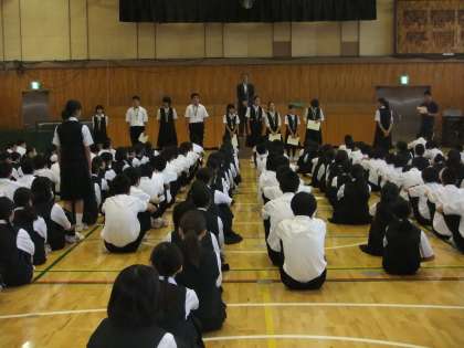9/29(月)大野校長先生より:修学旅行や職場体験がありましたが、これらの経験を無駄にしない生活を心掛けましょう。明日は63年目になる創立記念日です。多くの卒業生が地域にいらっしゃって皆さんを温かい目で見守って下さっています。一人一人が歴史の深さを感じて、より良い学校生活を送るよう努力しましょう。