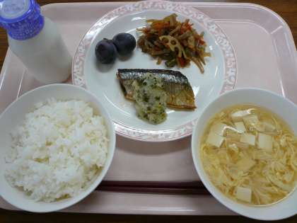 今日は今年初の秋刀魚でした。さんまは9月から11月にかけておいしい時期で、秋の味覚を代表する魚です。「秋に獲れる刀のような形をした魚」という所から、秋刀魚と書くようになったそうです。今日の秋刀魚は北海道産のもので、おろしソースをかけ食べました。骨を取るのに苦労している人もいましたが、秋の味覚を楽しみながら食べてくれていたようでした。