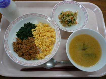 今日はツナを使った、3色そぼろご飯でした。ツナに砂糖・醤油・ゴマを合わせ、濃いめの味付けのそぼろに仕上げました。配膳が大変なメニューですが、各クラスで協力して準備をしてくれていました。残食もほとんどなく、食べてくれました。