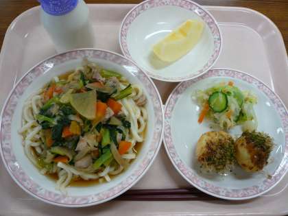 今日のたこ揚げくんは、じゃがいもを蒸してつぶし、片栗粉、刻んだキャベツ、たこを混ぜ、丸めて揚げています。ソースは中濃ソースに砂糖を混ぜたものとあおのり、おかかをかけて食べました。つぶしたり丸めたりするのに手間のかかるメニューですが、初めて食べる1年生は楽しみながら食べてくれたようです。