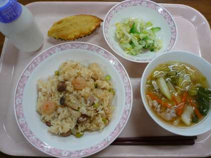 今日は、旬のさつまいもを使ってスイートポテトを作りました。給食では、約20キロのさつまいもを柔らかくゆでて裏ごしし、砂糖やバターなどを混ぜ、1つずつ丁寧にアルミに入れて作っています。焼き上がる時には甘い良い香りが漂っていました。