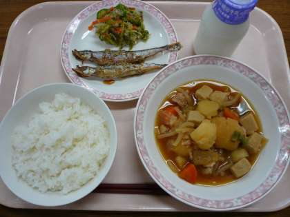 今日は雨で寒い日だったので、温かい肉じゃがが喜ばれていました。ししゃもの甘辛焼きは、しょうゆ・みりん・砂糖・酒・ゴマで甘辛たれを作り、教室でししゃもにたれをかけて食べました。今日の給食には、高野豆腐やししゃもが入っており、カルシウムもたっぷりの献立でした。