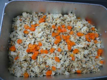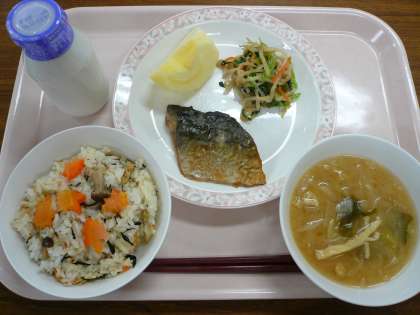 今日は10〜12月が旬の鯖を塩焼きにしました。秋鯖は脂がのっていて、おいしい季節になります。今日は北海道産の脂ののった魚屋さんおすすめの鯖が納品されました。秋の山路ご飯は、しめじ・ひじき・鶏肉・油揚げなどを煮含め、ご飯に混ぜ、もみじ型にくり抜いた人参を上に散らしました。秋を感じられる仕上がりで教室でも喜んでもらえたようです。