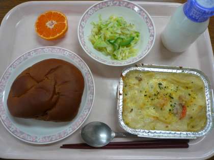 今日は駒中リクエスト給食・おかず部門4位のポテトグラタンでした。具にはポテト・マカロニ・人参・玉ねぎ・鶏肉・マッシュルームが入り、ホワイトソースは牛乳と豆乳で作った具だくさんのグラタンです。