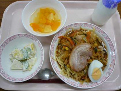 今日は以前より食べたいという声が多かった味噌ラーメンでした。野菜がたっぷり入った具だくさんスープで、廊下には良い香りが漂っていました。ボリュームもあり、「お腹いっぱい!」と苦しそうにしている子やベルトの穴をずらしている子もいました。今日は第3回定期テスト最終日、みなさんお疲れ様でした。