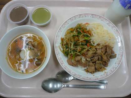今日のビビンパは、ご飯の上に豚肉・ナムル・大根の甘酢づけが乗っています。豚肉は、ご飯がすすむように豆板醤でピリ辛に味付けしています。大根は、さっぱりとした味付けになっています。また、今日は駒中リクエスト給食・デザート部門3位の豆乳プリンのリザーブでした。結果は抹茶129人、ココア136人とココアの方が若干人気でした。