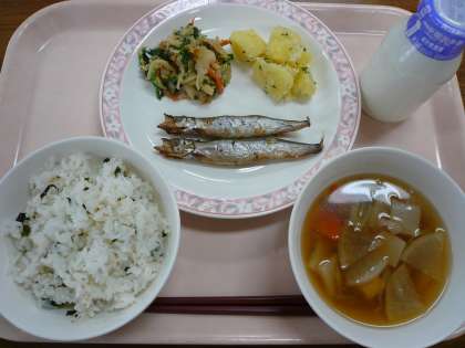 今日はカルシウムたっぷり給食でした。わかめご飯には「わかめ・ごま・じゃこ」、くるみ和えには「ほうれん草」、そして、「ししゃも」とカルシウムがたくさん含まれる食品を多く使っています。また、牛乳を残さず飲むように意識している子も増えてきて、寒くなってきましたが、飲み残し0のクラスも多く、このまま続けて欲しいと思います。