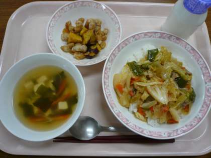 今日の回鍋肉丼は、キャベツが1人90g入っています。その他にも、玉ねぎ・人参・ピーマン・ねぎといった野菜を75g使っており、野菜たっぷりの回鍋肉丼でした。野菜だけでも42kgにもなるので、炒めるのがとても大変な献立ですが、どのクラスもほとんど残りなく食べており、嬉しく思います。また、さつまいもと大豆の揚げ煮も人気があり、「お豆の給食、大好きです」という声もありました。