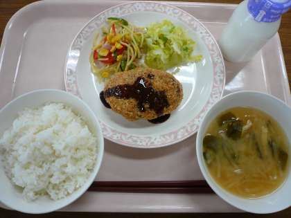 今日のコロッケには、茹でたいんげん豆と大豆を潰したものが入っています。1つ1つ手作りで作っており、豆嫌いの人でも気付かずに食べる事ができるので、人気メニューの1つです。どのクラスでもお代わりじゃんけんが開催されており、残しもほぼありませんでした。