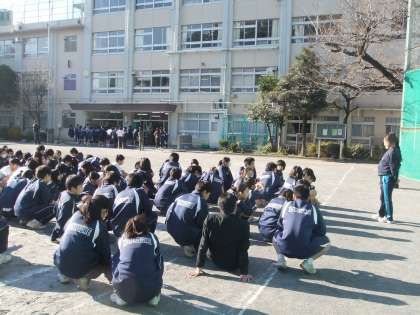 12/19(金)15:15〜地震発生に伴う避難訓練を実施しました。まだ氷が張っていた校庭に全生徒が速やかに避難できました。