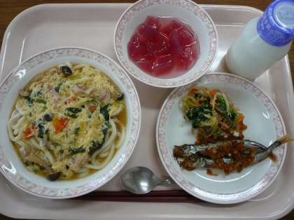 今日は寒かったので、温かいかき玉うどんが喜ばれました。かつお節で出汁を取り、しょうゆ・みりん・塩で調味しています。