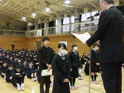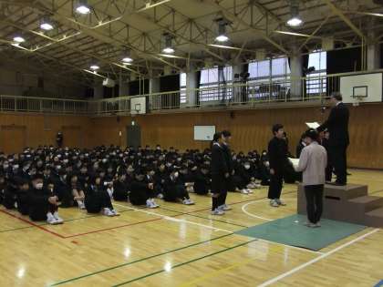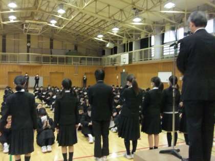 3/3(火)大野校長先生より:3学年揃っての最後の朝礼です。この一年に成長したことを実感できていますか。何かをすべき時に、楽な方ではなくあえて苦難の道を選んで努力したことが成長とその実感につながります。自分自身を大切にするのと同時に仲間・友達を尊重することですばらしい学校生活を送ることができます。このことを今一度しっかり考えて実行して下さい。