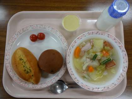 1学期初めてのパンのメニューです。ミニトマトは意外と苦手な人が多く、食べ残しがありましたが、栄養がたくさんあるので積極的に食べてほしいです。