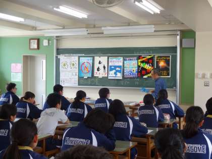 3年B組は美術の授業。ポスター作成のため、まずはレタリングの学習を行います。説明に対し、静かに真剣に聞き入っています。