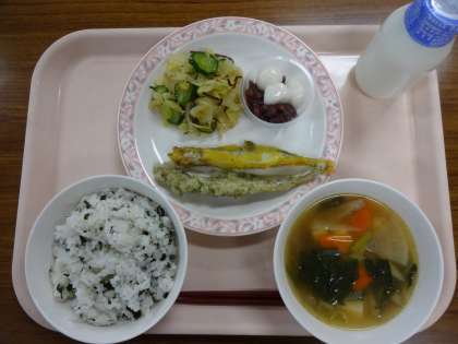 ししゃもの二色揚げは、カレーと青のりの2つの味が楽しめます。小豆白玉のちょこっとデザート付きです。