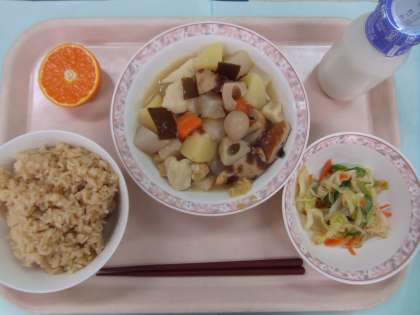 寒くなってきたので、おでん料理です。おでんには、大根、こんにゃく、さつまあげ、昆布、じゃがいも、人参、ちくわ、ちくわぶ、うずら卵等具だくさんです。一口大位の大きさに切ったので、全種類食べられると思います。おでんは和風料理の中でも親しみやすい料理で、よく食べていました。味噌ドレッシングサラダは、和風の料理によく合います。おでんの組み合わせの定番として、茶飯(しょうゆご飯)を提供しました。こちらもよく食べていました。