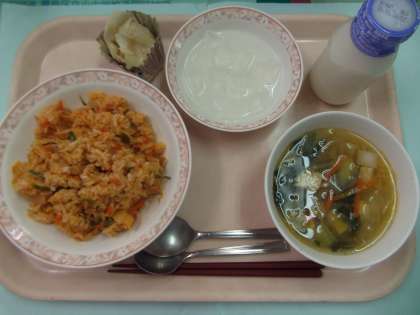 キムチチャーハンは、キムチの程よい辛みをつけた、生徒に人気のメニューです。食が進むようです。じゃんぼ焼売は、直径11cmの焼売の皮に具を包んで蒸します。豚挽肉の他、豆腐や生姜が入り、さっぱりといただけます。こちらも完食でした。スープは青梗菜、白菜、人参、鶏肉、豆腐等具だくさんです。体が温まりました。レモンスカッシュゼリーは、シュワシュワ感が残るゼリーで人気メニューです。こちらも完食でした。