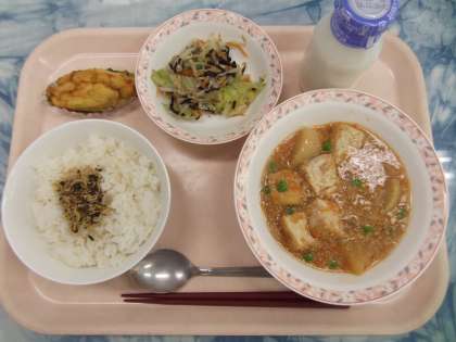 ふりかけは、菜飯の素とちりめんじゃこ、ごまを合わせたものです。シンプルな味付けですが、よく食べてくれます。大根と生揚げのそぼろ煮は、冬が旬の大根をたくさん使い、鶏挽肉や人参をあわせたそぼろあんを生揚げと一緒に煮ました。とろみもつけ、冬らしいメニューです。デザートに小ぶりなスイートポテトをつけました。こちらも人気メニューです。