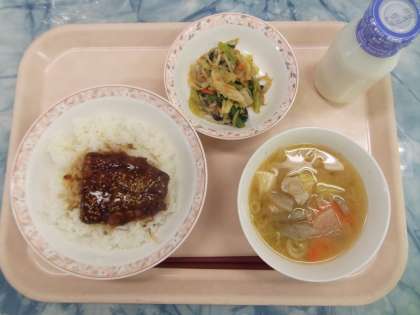 さんまの蒲焼き丼は、甘辛く味付けして揚げたさんまの開きをご飯の上にのせます。甘辛いたれのかかった丼物はご飯が進みます。骨まで食べられ、カルシウムもたっぷりです。きちんと食べられていました。豚肉や豆腐、野菜類がたくさん入った豚汁は、体が温まりました。豚汁は冬に食べたくなる料理です。魚や野菜が使われた和食献立でしたが、よく食べていました。