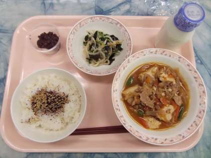 ゆかりふりかけには、ちりめんじゃこと炒りごまが入り、香ばしく仕上がりご飯が進みました。今日は「鏡開き」ということで、給食室で小豆を煮て、白玉団子の上にかけ、お汁粉のイメージで提供しました。肉豆腐は焼き豆腐と豚肉がたくさん入った煮物です。食べやすい煮物のようでよく食べていました。肉や豆腐等のタンパク質をたくさんとることは、体を温めてくれます。